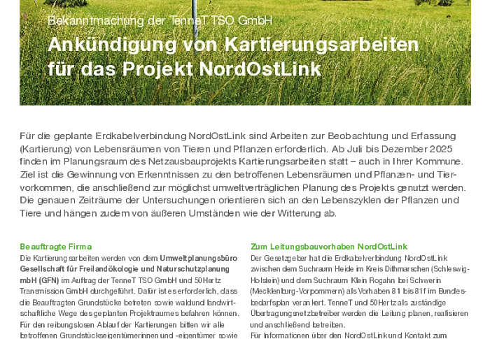 Bekanntmachung der TenneT TSO GmbH: Ankündigung von geoelektrischen Messungen für das Projekt NordOstLink